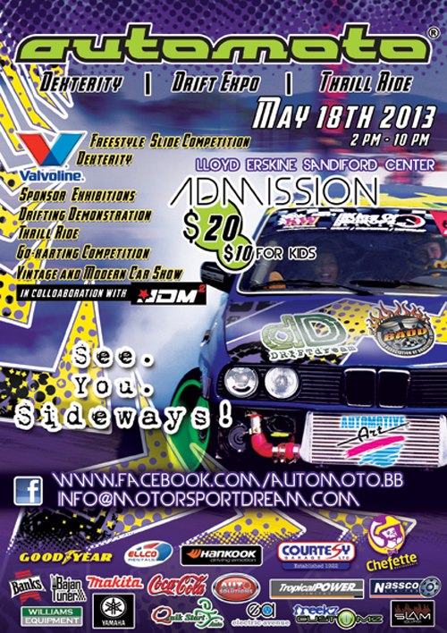 The long anticipated Automoto 2013 is finally here!! Like last year it will be held at the Lloyd Erskine Sandiford Center on May 18th but it’s promised to be even bigger with karting being added to the day’s line up of entertainment and the return of the “thrill ride” and dexterity competition. It’s not just a car show, it’s a family day for everyone! Kids can enjoy the many activities such as face painting provided by Chefette and other children’s games and activities, while the parents can view and interact with sponsors from a variety of industries. There will be thousands of dollars in giveaways and promotions from sponsors. I’m sure you guys will really make the effort to come out and have a great time. The flyer with information on the event is below. Everything you need to know is on it and if you still want more information, I’ve provided a link to the Facebook event page as well.